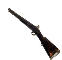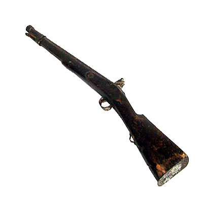 Espingarda de cano simples com a ponta mais larga e frisada, encaixado em um cabo de madeira, possuindo à frente um aro de fixação do cano e uma alça inferior; à frente, apresenta ainda uma vareta de ferro encaixada embaixo do cano, e que serve para socar a pólvora em seu interior; parte central com o mecanismo de armação e disparo da espingarda, composto por uma alavanca que faz apertar uma mola e um pino com parafuso, que é puxado para trás e disparado à frente, quando é acionado o gatilho, envolto em uma alça curva e situado na parte inferior do corpo; cabo mais largo e achatado lateralmente, com um ressalto curvo superior, e revestido no extremo por uma chapa de bronze