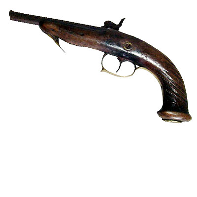Pistola de cano único com formato octogonal (oito lados). O corpo é de madeira e o cabo é decorado com entalhes em forma de setas. A ponta do cabo é mais larga e finalizada com uma peça de bronze em forma de palmeta (folha estilizada). Na parte de cima, há um pino curvo usado para armar a pistola. Na parte de baixo, fica o gatilho, também curvo, protegido por uma alça de bronze, que termina em uma haste presa ao cabo. Na frente da arma, abaixo do cano, há um pequeno orifício com um tubo de bronze encaixado.