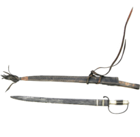 Sabre com lâmina em forma de retângulo, que vai afinando até chegar a uma ponta arredondada. O cabo tem duas faixas de prata e uma parte central com oito lados, feita de madeira. Possui uma alça curva de proteção, que liga a parte de trás do punho à base da lâmina, terminando em uma curva voltada para baixo.