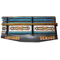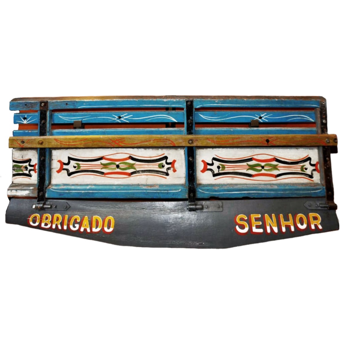 Traseira de caminhão em madeira com pintura decorativa. A estrutura é formada por tábuas horizontais e verticais. Na parte superior, as tábuas são pintadas de azul com desenhos brancos. Abaixo, há painéis brancos com desenhos coloridos em preto, verde, vermelho e laranja. A parte inferior é pintada de preto, com as palavras “OBRIGADO SENHOR” escritas em letras grandes, amarelas com contorno vermelho.