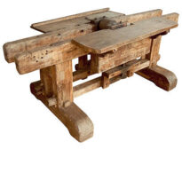 Mesa feita em madeira, a base tem pés transversais e um recorte em forma de semicírculo na parte inferior. Sobre essa base se apoia uma estrutura com quatro pernas retas, unidas por travessões na parte de baixo e na parte de cima, formando um tampo aberto no centro. Nesse espaço fica uma polia central, que ao ser girada por uma correia movimenta uma broca de ferro comprida, posicionada em um dos lados. Esse lado da broca possui um sistema de apoio móvel, semelhante a um pequeno tampo que pode deslizar para trás ou ser rebaixado por meio de um torno de ferro, acionado por uma roda localizada na parte inferior. O movimento é guiado por suportes fixados na lateral da bancada. No lado oposto à broca há uma segunda estrutura muito parecida, mas em vez da roda do torno possui apenas um pequeno disco, permitindo também movimentos para cima, para baixo e para os lados.