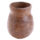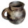 Jarro de barro cozido, em tom escuro com uma pintura ao meio, com desenho de três flores em vermelho, verde e amarelo; forma bojuda com o fundo plano, com uma alça curva ao centro voltada para o alto e a boca estreita circular com um pequeno bico oposto à alça.