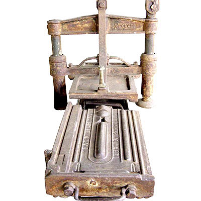 repuxo onde se prende parte da alavanca da prensa; a prensa propriamente dita, é de ferro, constitui-se de um trenó inferior onde