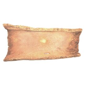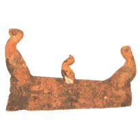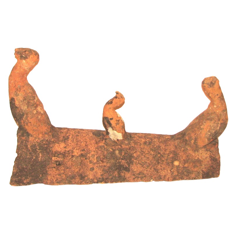 Telha no formato de meia-cana, mais larga em um dos extremos; possui três passarinhos na parte superior, os maiores nas extremidades e o menor ao meio.