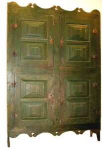 Armário retangular vertical, com quatro portas frontais, em almofadas salientes, em pares, frisadas, separadas por montantes lisos; fechaduras com espelhos recortados e vazados, com puxadores em pingentes; com duas dobradiças em cada porta; parte superior e inferior em recortes curvos; laterais com seus pés recortados em semicírculo apontado. Frente pintada de verde; parte interna com três prateleiras; sendo que a do meio divide o armário em dois compartimentos incomunicáveis entre si.