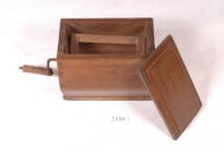 Batedor de manteiga, no formato de um hexágono; em seu interior possui uma armação retangular de madeira, que, através de um orifício lateral, se prende em uma manivela; esta é de ferro e tem uma pega de madeira; tampa retangular, com a parte interna frisada; base com quina.