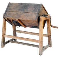 Caixa paralelepípedica de madeira, de grandes dimensões, reforçada com aros de ferro transversais nas extremidades, com um pino de ferro fixado ao meio das laterais quadrangulares transversais , que se encaixam em duas travessas laterais superiores de um cavalete de madeira, com pernas em secção retangular amarradas inferiormente por um travessão longitudinal, duas travessas laterais e dois outros travessões longitudinais superiores; um dos pinos da caixa termina em uma manivela de ferro com pega de madeira, que ao ser manipulada proporciona o movimento giratório da caixa sobre seu eixo longitudinal; uma das laterais retangulares longitudinais da caixa possui uma abertura retangular na metade oposta à manivela, que serve para a colocação da nata do leite no interior da caixa e o recolhimento da manteiga, entre duas barras paralelas de madeira fixadas transversalmente à lateral da caixa, com uma tampa que é fechada por meio de uma alça semicircular de ferro provida de um parafuso central que desce até a tampa, trespassando uma pequena barra de ferro ali fixada e a própria tampa, que deve ter uma rosca interna que permite mantê-la fechada; na lateral direita da caixa, a partir da manivela e em relação à lateral que tem a tampa, existe um orifício circular localizado logo acima da aresta inferior e um pouco depois da metade da lateral, e que deve ser vedado por uma rolha e aberto eventualmente para escorrer o soro durante o processo.