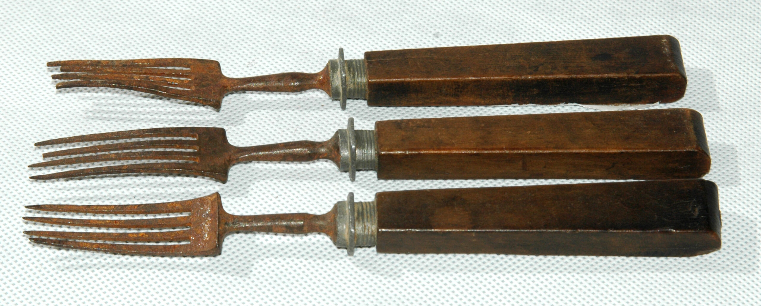 Conjunto de três garfos com cabo de madeira, retangular, com o extremo superior arredondado; extremo inferior do cabo com um cilindro de alumínio rosqueado, com uma das estrias em alto relevo, na forma de disco; ao cilindro é acoplado uma haste cilíndrica de ferro, terminada em uma estrutura de secção retangular, recortada em quatro longos dentes, finos e potiagudos.