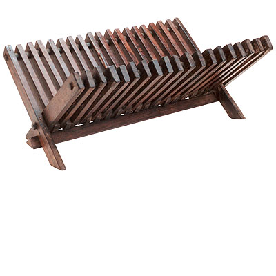 Utensílio constituído por dezenove pares de ripas cruzadas em "X", espaçadas entre si de modo suficiente para alojar dezoito pratos, um entre cada par de ripas, com os pares dos extremos formando os pés, estes travados por uma travessa longitudinal fixada superiormente; as partes onde as ripas se cruzam são atravessadas por um eixo cilíndrico, assim como os extremos superiores das ripas