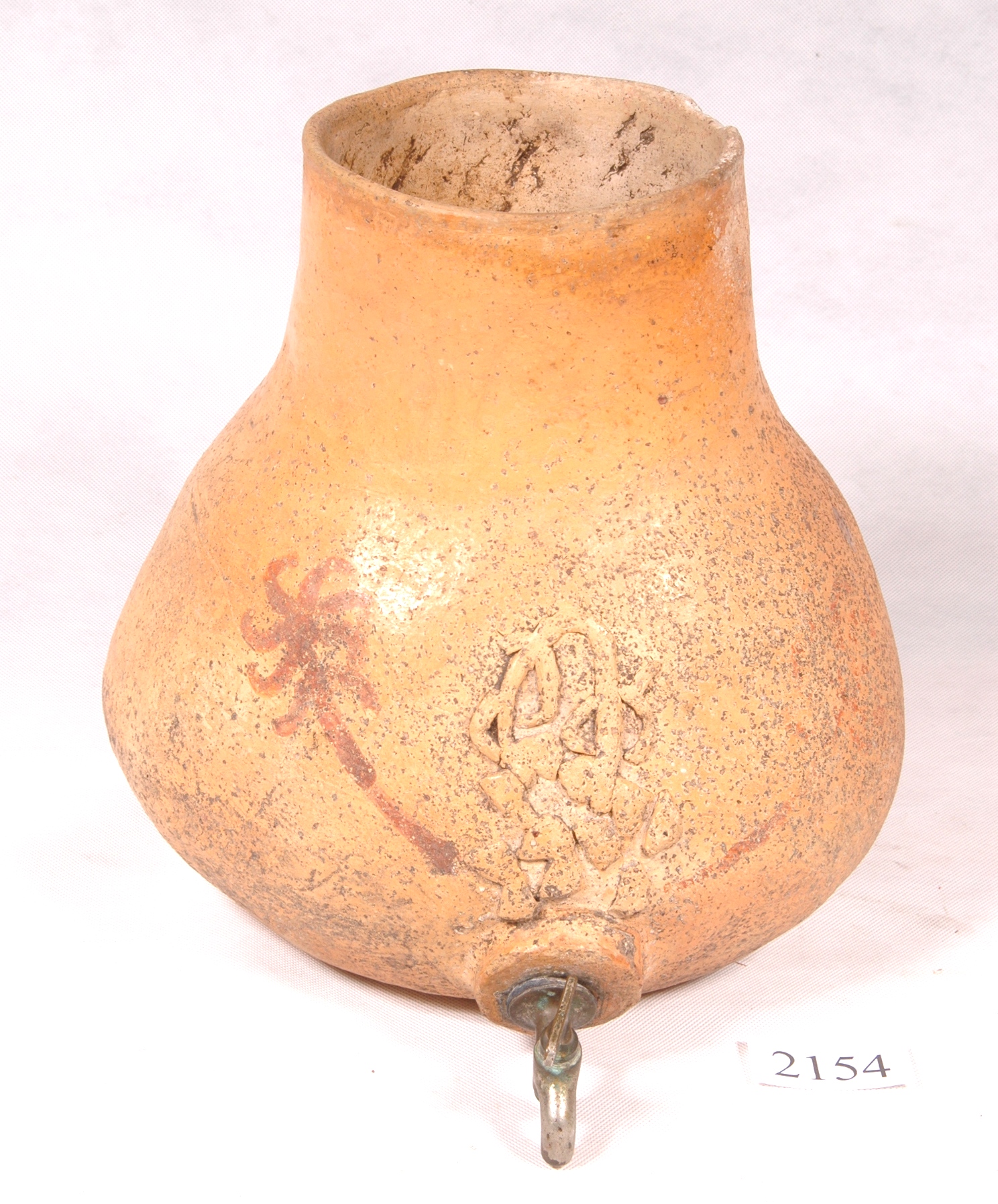 Filtro de forma bojuda, com a parte superior mais estreita, formando a borda; na parte inferior há um ressalto circular, com orifício, onde se encaixa uma torneira, esta de chumbo; acima da torneira há decorações em motivos fitomorfos em alto relevo e pintura.