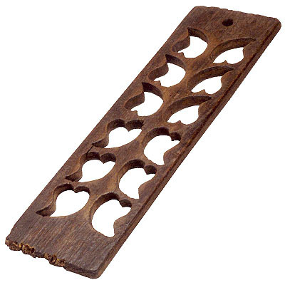 Forma retangular em madeira escura, comprida, entalhada em doze cavidades em formato de coração em sua extensão, e com um pequeno recorte circular vazado superior, provavelmente para dependurar.