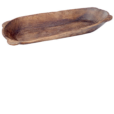 Gamela comprida e rasa em madeira entalhada longitudinalmente no tronco originário, empenada em seu sentido longitudinal, de superfícies interna e externa planas, e de extremos arredondados com as quinas arrematadas por um recorte em orelha.