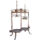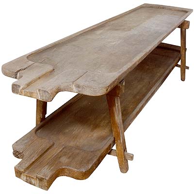 Mesa de madeira, comprida e estreita, com dois tampos sobrepostos rebaixados nas partes centrais e com os extremos em recortes curvos, levemente inclinados para um extremo com uma abertura em canaleta projetando-se para fora em forma de um bico reto, apoiados sobre dois cavaletes grossos, de pernas e travessas em secção quadrangular.