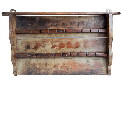 Porta-talheres em forma de uma pequena prateleira, com a parte superior mais larga, de extremos em recorte curvo, e as laterais em recortes semicirculares estreitando-se inferiormente; centro com duas travessas horizontais em madeira escura, recortadas em uma série de dentes em forma de rabo de andorinha ou "malhete"; superiormente apresenta duas pequenas chapinhas de zinco com um orifício, para dependurar em uma parede.