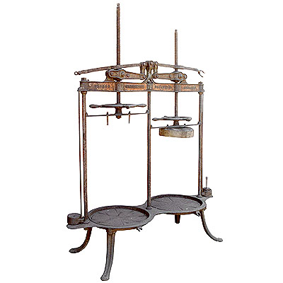 Prensa dupla de queijos, de ferro, com quatro pernas recurvadas e com um friso central; base em forma de duas bandejas circulares, rebaixadas ao centro e com a superfície interna marcada com raios em canaleta, que servem para o escoamento do soro até um bico aberto nas bordas ressaltadas lateralmente em curva, na frente, as bordas servindo também de apoio ao guia dos pesos; da base elevam-se três barras cilíndricas, que conduzem as bandejas móveis superiores da prensa, em forma de um disco circular espesso e de superfície plana, atravessadas por uma guia de ferro, de cujo centro eleva-se um torno comprido, girado por meio de uma roda horizontal com quatro raios sinuosos e quatro pegas abauladas; o torno atravessa um tambor localizado em um travessão largo disposto na horizontal, preso ao extremo de cada uma das barras condutoras; do centro desse travessão eleva-se um curto ressalto curvo, onde encaixam-se os extremos de um sistema de alavancas de pressão, sendo uma inferior mais curta e grossa, que tem presa um tambor onde enrosca-se o parafuso do torno, e a outra mais comrpida e fina, com um gancho extremo, onde são engatados os pesos, estes conduzidos pra baixo através de uma barra fina paralela às barras de condução externas; ao serem engatados nas alavancas superiores, os pesos fazem com que estas pressionem o torno para baixo, exercendo assim a pressão necessária sobre os queijos colocados entre as bandejas inferiores e superiores.