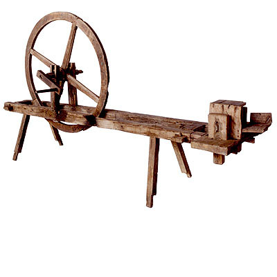 circunferência da roda é escavada em meia-cana, onde se encaixa uma correia que faz girar uma pequena polia, situada no outro