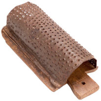 extremos em uma alça quadrada com um orifício ao meio; sobre a base se fixa a chapa de latão, toda perfurada e dobrada em