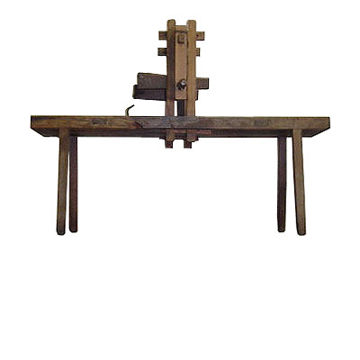Estrutura composta de uma mesa retangular de madeira, baixa, com pernas em cavalete; lateralmente, ao centro, elevam-se dois