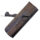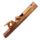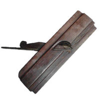 ferramenta de madeira maciça, de formato alongado e retangular, com acabamento escurecido pelo tempo. Sua base apresenta molduras em relevo, criando linhas curvas e retas que percorrem toda a extensão. Na parte superior, há uma lâmina de ferro inclinada, fixada por uma cunha de madeira que a mantém firme no encaixe. O conjunto mostra sinais de desgaste, especialmente na lâmina, indicando seu uso prolongado