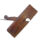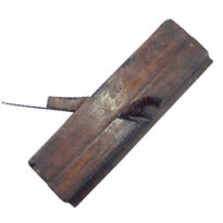 Objeto de madeira de formato retangular alongado, com aspecto maciço e robusto. A peça apresenta uma abertura central em ângulo, por onde sobressai uma lâmina metálica escura e fina, levemente oxidada pelo tempo. No corpo do objeto é possível notar linhas paralelas em baixo-relevo, acompanhando seu comprimento, bem como marcas de desgaste natural, arranhões e pequenas irregularidades na superfície, indicando longo uso. A madeira possui coloração castanho-escura, com variações de tonalidade que vão do marrom avermelhado ao marrom mais opaco, sugerindo envelhecimento e contato frequente com as mãos. Não há inscrições visíveis, apenas a textura natural da madeira e as marcas do trabalho manual em sua confecção.