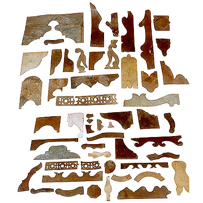 Conjunto composto por 45 moldes com recortes retos e curvos variados, utilizados principalmente na confecção de mobiliário; dentre eles destacam-se os destinados aos cantos de cabideiros, cabides, pés de armários e arcas, decoração de mesas. etc; também encontram-se incluídas algumas peças de madeira, recortadas segundo os moldes.