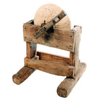 Pedra de amolar em formato de roda rústica, instalada sobre uma caixa de madeira retangular apoiada em duas pernas retas, reforçadas por travessas longitudinais e dois pés transversais para maior estabilidade. No centro da pedra, passa um eixo de madeira de formato quadrangular, que possui uma manivela em uma das extremidades. Perto das pontas, o eixo apresenta duas partes arredondadas, que se encaixam em suportes quadrangulares fixados nas laterais da caixa, permitindo que a roda gire suavemente quando a manivela é acionada. A madeira mostra marcas do tempo e leve escurecimento, e a pedra apresenta desgastes visíveis, típicos do uso prolongado.