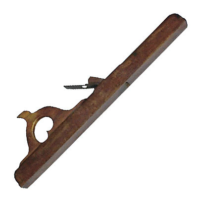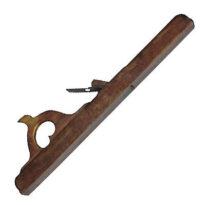Possui uma estrutura retangular, chamada cepo, que abriga ao centro uma lâmina de metal dupla, composta pelo ferro principal e uma capa. Na parte superior, há uma asa ou pega para manusear a ferramenta com facilidade. A superfície mostra sinais de uso e desgaste típicos de uma ferramenta antiga, com o acabamento simples e a madeira escurecida pelo tempo, refletindo sua longa trajetória de trabalho. A lâmina é ajustável para garantir aplainamento preciso e reto das superfícies de madeira.