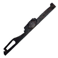 Objeto confeccionado predominantemente em madeira maciça, de formato alongado e retangular, com proporções estreitas e estrutura robusta. No corpo central, observa-se uma abertura inclinada por onde emerge uma lâmina metálica escurecida, ligeiramente oxidada, fixada por uma pequena cunha de madeira. A superfície apresenta coloração castanho-escura com nuances avermelhadas e áreas mais claras nas extremidades, resultado do desgaste natural e da ação do tempo. É possível notar marcas lineares e arranhões ao longo do corpo, evidenciando o contato repetido com outros materiais. A textura da madeira é irregular, com pontos de polimento em áreas de manuseio frequente e pequenas lascas nas bordas. Não há inscrições visíveis, apenas as marcas deixadas pelo uso e pelo envelhecimento do material.