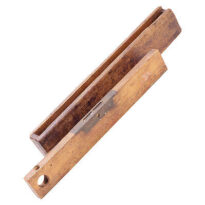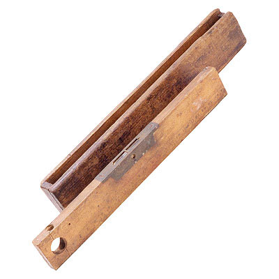 Esta peça apresenta uma caixa de madeira lisa e envernizada, com formato retangular e um pequeno furo circular em uma das pontas. Nos cantos, há reforços em metal, trazendo maior proteção. Sobre sua superfície, podem-se ver números em metros e polegadas, facilitando a leitura das medidas. No centro, fica um tubo de vidro horizontal, preenchido quase totalmente por álcool, formando uma pequena bolha que serve como referência visual. O tubo está protegido por uma chapa metálica e todo o conjunto é cuidadosamente guardado dentro de sua própria caixa de madeira
