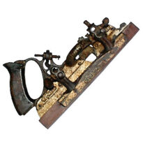 Peça em aço, formada por três partes móveis que deslizam sobre duas hastes cilíndricas horizontais. A peça principal, localizada à direita, possui um cabo oco com pega de madeira envernizada e curva, proporcionando melhor empunhadura. Nela estão as principais tarrachas de ajuste em formato de borboleta, que controlam a altura e a inclinação do ferro cortante. A peça central trabalha junto à primeira, funcionando como apoio do ferro e também permitindo o ajuste da sua largura. Já a peça da esquerda apresenta uma ripa de madeira envernizada fixada à base, que atua como guia, mantendo o alinhamento da ferramenta em relação à borda da madeira trabalhada. As três peças são presas às hastes por torniquetes de ferro. O objeto combina metal e madeira polida, com superfícies bem conservadas e discretas marcas de uso que revelam sua antiga funcionalidade artesanal.