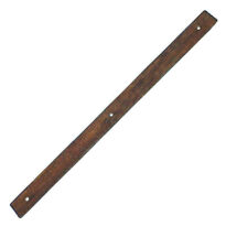 Régua de carpinteiro, em madeira envernizada, comprida, de formato retangular; com três orifícios de 0,5 cm de diâmetro, sendo um no meio e um em cada extremidade, equidistantes 26,5 cm do centro.