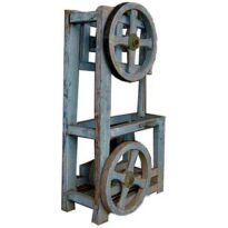 Peça estrutural confeccionada em madeira maciça, composta por um conjunto retangular que sustenta duas grandes rodas circulares paralelas. As rodas possuem eixos metálicos centrais e reforços em cruz, demonstrando equilíbrio e precisão no encaixe. A madeira apresenta coloração azulada esmaecida, com partes amareladas e desgastadas, resultado da ação do tempo e do uso prolongado. A superfície revela marcas de atrito, lascas, manchas e pequenos pontos de oxidação nos componentes metálicos. A pintura, já envelhecida, descasca em algumas áreas, permitindo ver o tom natural da madeira por baixo. O conjunto possui proporções altas e robustas, com aspecto funcional e artesanal.