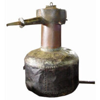 Alambique em cobre, com uma grande panela cilíndrica e bojuda, com a base e a parte superior arredondadas, com um cano junto à base e com uma abertura circular na superfície superior, onde apresenta ainda duas outras aberturas, fechadas por placas fixadas por arrebites; coluna central tubular cilíndrica e lisa, com um aro inferior na parte da emenda; parte superior com o capelo, constituído por um recipiente circular, aberto, com dois canos finos laterais para o encaixe da serpentina, no interior do qual aloja-se outro recipiente, de forma semi-esférica e arrematado superiormente por uma coroa circular com uma alça central, munido de um cano grosso (que se encontra solto), na forma de uma tromba cônica e reta, inclinado para baixo, com um disco circular perpendicular junto ao extremo, e cuja extensão atravessa também o recipiente externo do capelo.