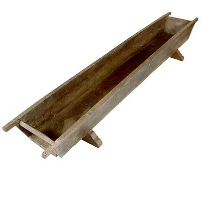 Cocho comprido e baixo, de forma paralelepípedica, mas com as laterais inclinadas, deixando a base mais estreita, com as quinas superiores terminadas em uma curta pega retangular, e apoiado sobre dois pés transversais com os extremos recortados em curvas.