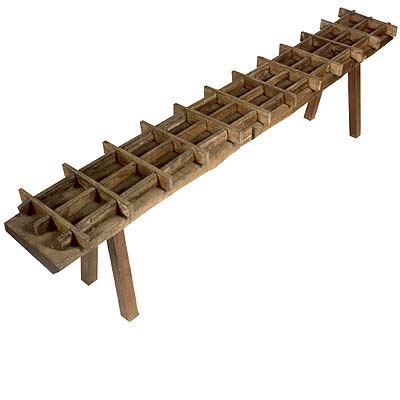 Fôrma de rapaduras, em madeira, composta por um engradamento com vinte e dois vazados paralelepípedos, dispostos par a par na longitudinal, com as travessas transversais e longitudinais ultrapassando a sua largura; essa grade se apoia em uma mesa baixa, comprida e estreita sobre cavalete, com quatro pernas de secção quadrangular.