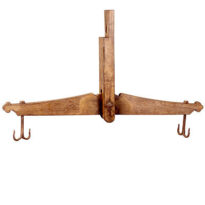 Balança de madeira formada por um travessão (a barra principal), que é reto na parte de baixo e curvo na parte de cima, ficando mais largo no centro. Esse travessão é preso a um suporte retangular de madeira, que tem um orifício circular no meio e um dente na parte superior. A fixação é feita por um parafuso de ferro comprido, apertado com uma porca. Nas duas extremidades do travessão, há recortes em forma de trifólio (desenho de três folhas ou arcos). Em cada ponta, está preso um gancho duplo de ferro, fixado na parte de cima também por uma porca.