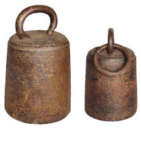Par de pesos em tronco de cone, com a borda superior circundada por um friso e arrematados por uma alça ligeiramente achatada, de tamanhos e pesos diferentes; os pesos apresentam uma cavidade circular por baixo, que encontram-se vedadas por um metal pesado fundido; o peso menor possui encaixada na alça uma argola circular.