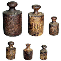 conjunto de pesos de ferro fundido usado com balanças comerciais/romanas e balanças suspensas para contrabalançar a carga no prato e permitir a leitura do peso pelo equilíbrio
