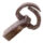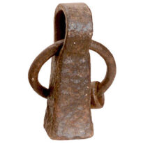 Peso de ferro em formato quadrado, mas com os cantos arredondados. Na parte de cima, há uma alça larga com abertura em forma de círculo, levemente achatada. Presa a essa alça, encontra-se uma grande argola circular de ferro. Dentro dela, está ligada ainda uma argola menor, também circular e achatada.