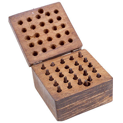 Estojo de madeira, de forma quadrangular paralelepípedica, composto de dois blocos unidos por duas dobradiças, sendo um dos blocos mais estreito, formando a tampa; interior dos blocos perfurados em vinte e seis orifícios cilíndricos perfilados, sendo um deles de diâmetro um pouco maior, nos quais se alojam vinte e seis ponteiras de aço, de secção quadrangular, com uma extremidade mais estreita e elevada, em cada ponteira é representada uma das letras do alfabeto, que servem para gravar