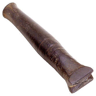 Marcador de couro, de ferro, de forma cilíndrica, abaulado no centro onde se notam frisos, com um sulco reto na porção superior; extremidade anterior terminada em uma marca formada por um "X" com os quadrantes estriados; extremidade posterior mais fina e achatada, para receber os impactos do martelo.