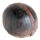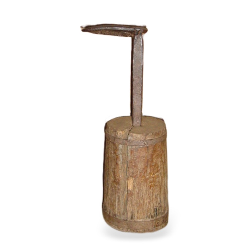 pé de ferro que apresenta uma base cilíndrica robusta, confeccionada em madeira maciça com dois aneis de ferro em volta das extremidades. A madeira exibe tonalidade amarronzada, com rachaduras longitudinais e marcas de impacto. No topo da base, encontra-se encaixada uma haste vertical de ferro forjado, de seção estreita e alongada, fixada à madeira.