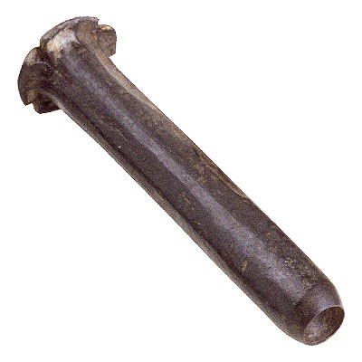 Ferramenta de ferro, de secção cilíndrica, com a extremidade anterior mais fina, formando um corte circular; extremidade posterior amassada e partida, devido aos impactos do martelo.