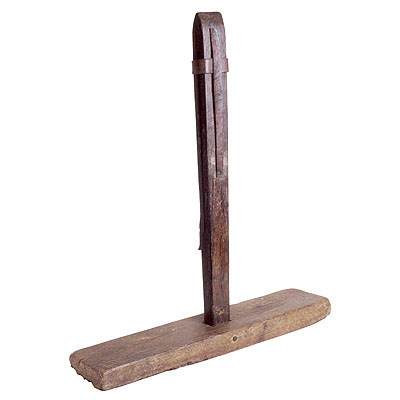 Instrumento em madeira, composto de duas partes, uma comprida e inteiriça e a outra menor, que se encaixa na anterior, unidas através de uma tira de couro; a extremidade superior é mais larga, tem as pontas chanfradas e arredondadas, na qual há uma folga interna entre as duas partes, permitindo mobilidade, que é apertada ou afrouxada por meio de uma correia de couro que corre em sua extensão; o extremo inferior é mais estreito, e fixa-se a uma base de madeira, paralelepípedica.