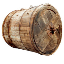 Tambor para o curtimento de couro, cilíndrico, de grandes dimensões, composto por grossas pranchas de madeira, pregadas e reforçadas por quatro aros de ferro; possui ainda em sua circunferência, despontando para fora, grossas cabeças oitavadas de ferro; é provido de uma pequena tampa retangular central, com alças de ferro e trava com parafuso provido de manípulo; laterais circulares com um pino comprido e grosso de ferro, cilíndrico, para o apoio do tambor sobre um cavalete; uma dessas laterais possui uma grande roda dentada de ferro, à maneira de engrenagem.