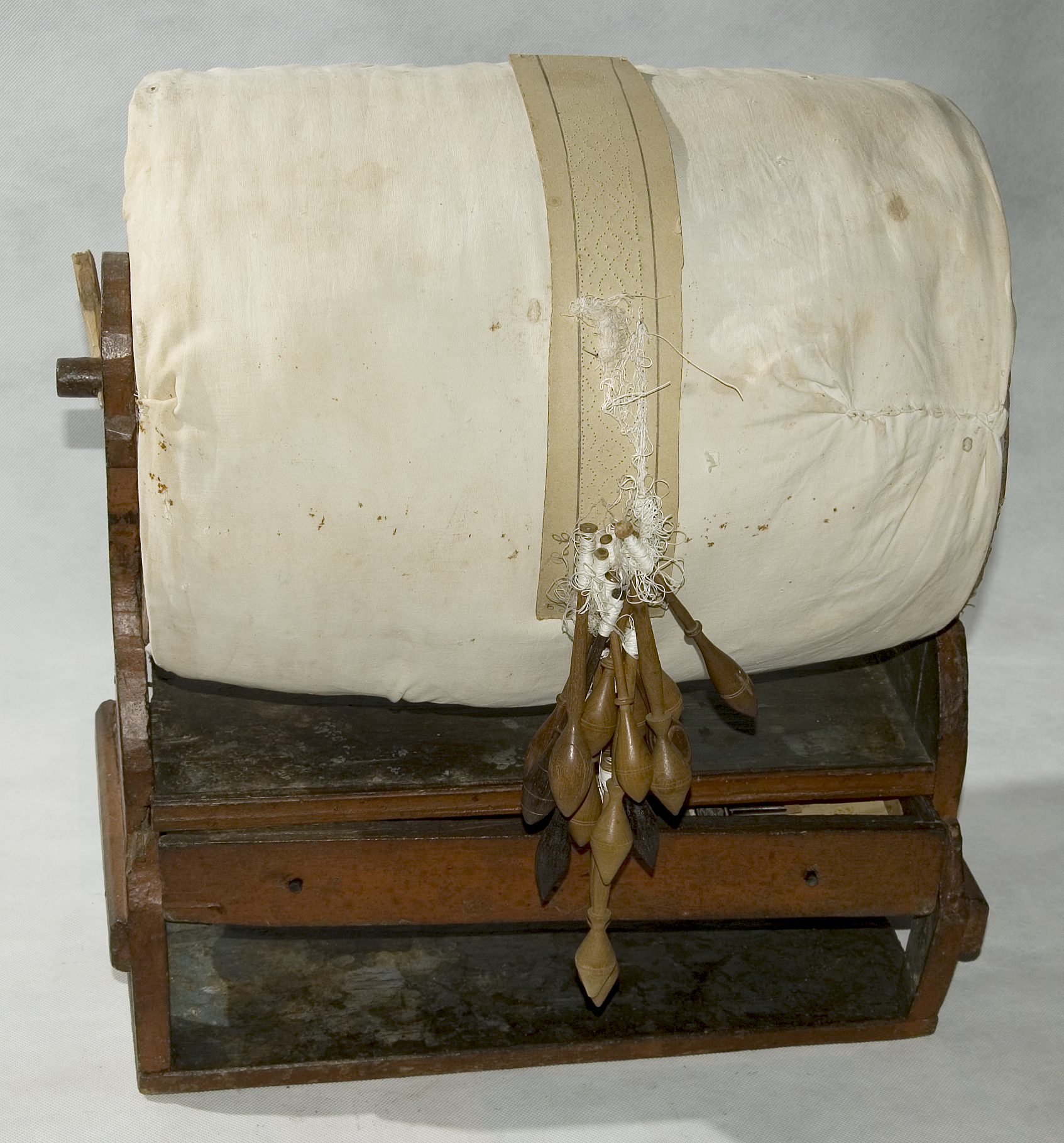Almofada de Bilros para renda, com enchimento de algodão, com uma tira de papel costurada no centro, onde se amarram os bilros; almofada montada em uma estrutura de madeira retangular, em cujas laterais elevam-se uma haste, que prende a almofada; com