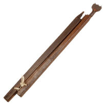 Objeto composto por duas hastes de madeira que se encaixam, de forma a aumentar ou diminuir o seu comprimento, unidas por um cordão que se introduz em orifícios localizados nos extremos em que se encontram encaixadas; os outros extremos são terminados em pinos estreitos, sendo que num deles se encaixa uma meia-lua de ferro com três dentes na ponta.