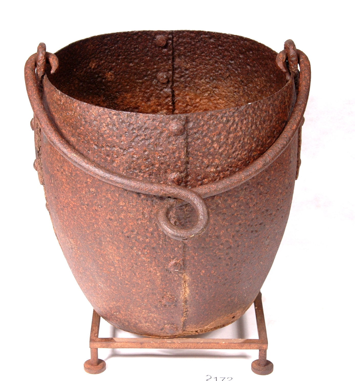 Cadinho de ferro, na forma de um barril, de grandes dimensões, composto por cinco chapas, sendo quatro compondo as laterais e uma no fundo, unidas por arrebites; na borda superior possui dois aros de ferro, nos quais se encaixam uma alça; esta retorcida na parte superior formando um orifício.