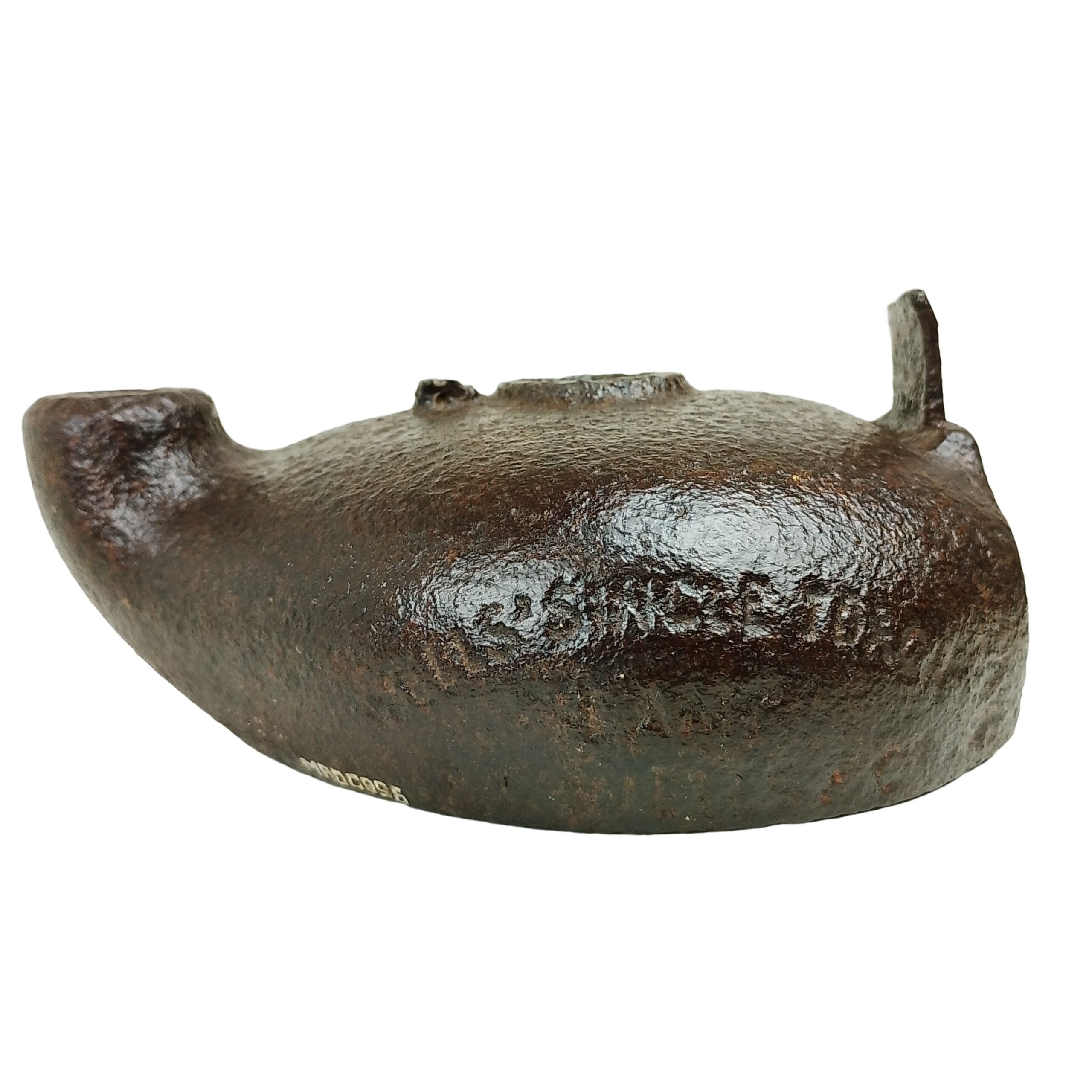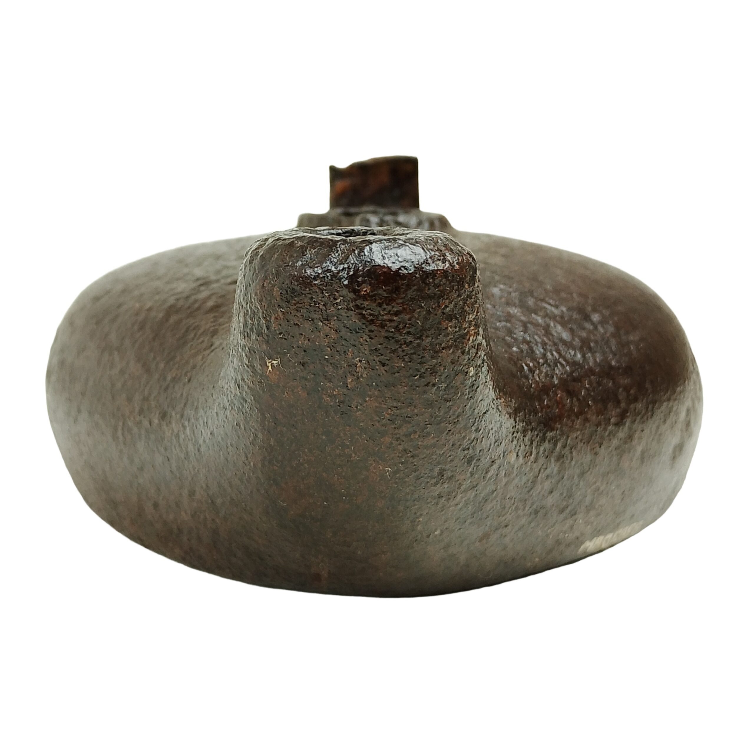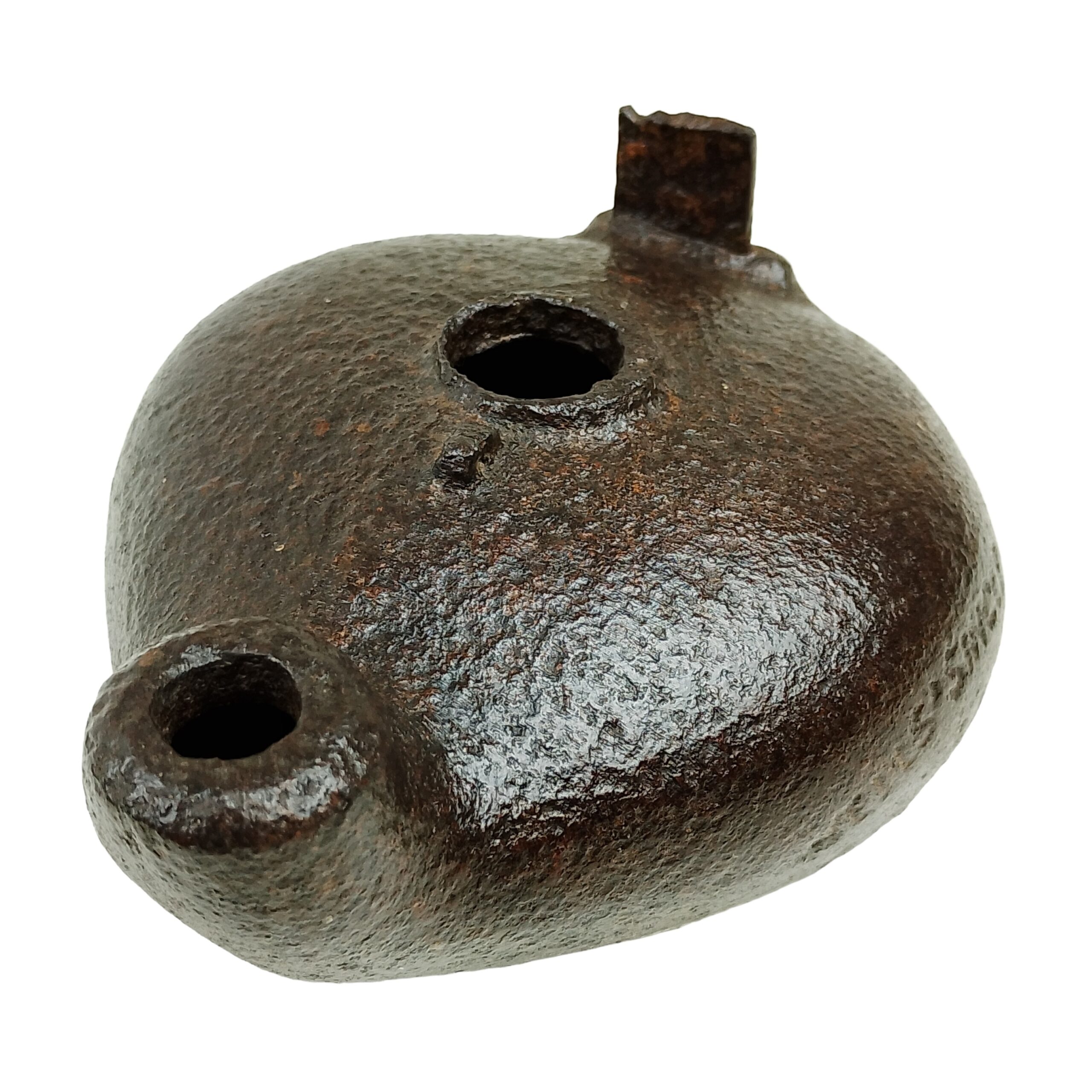 Candeeiro com bojo de forma oval, achatado, com a parte posterior plana e a parte anterior terminada em bico cilíndrico, recurvado ao alto na extremidade; centro com um orifício circular; tem, na parte posterior e ao meio, à frente do orifício, vestígios salientes do que deveria ser uma alça.