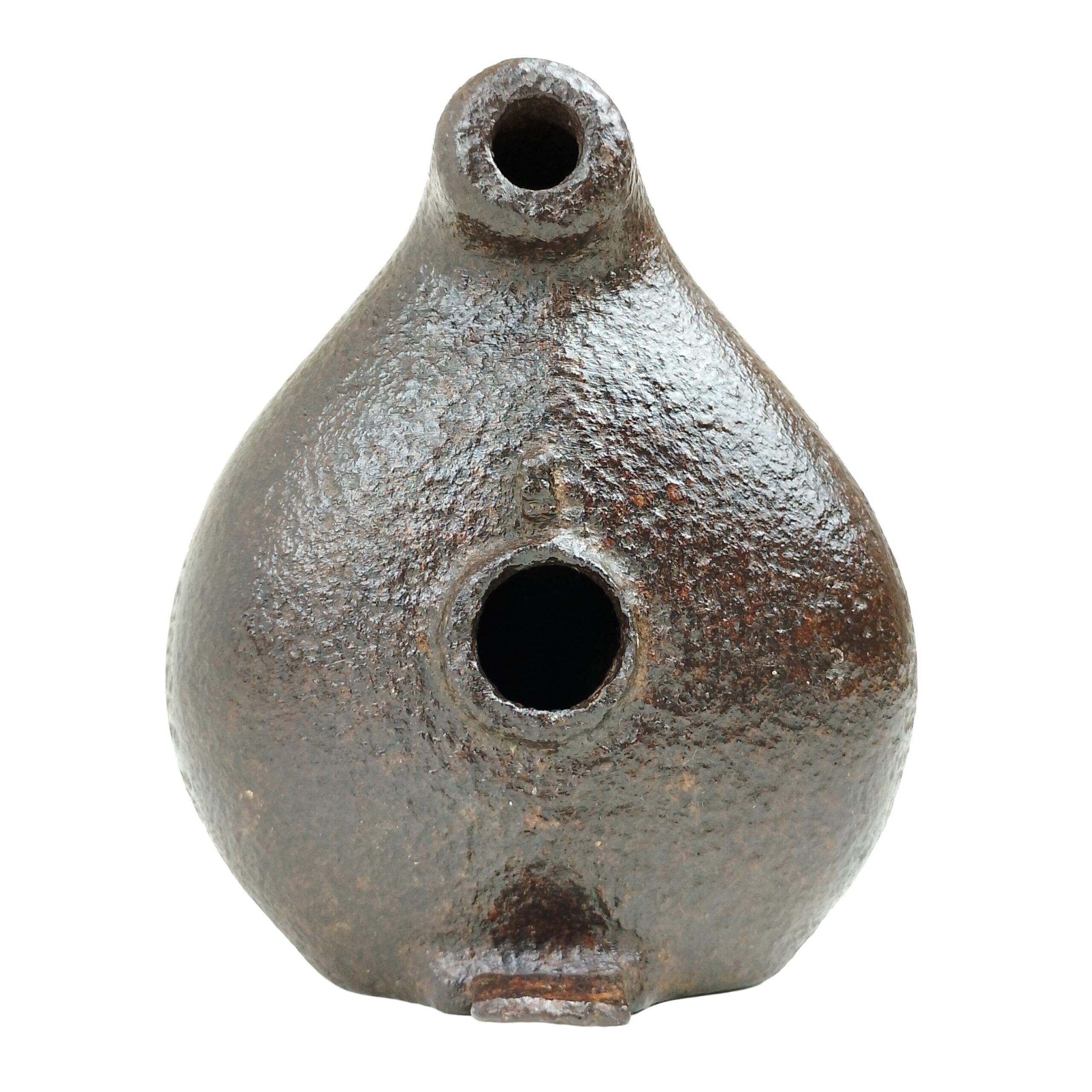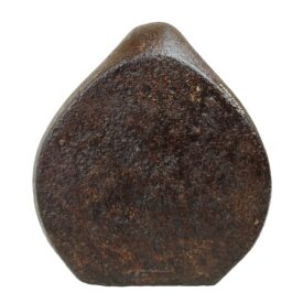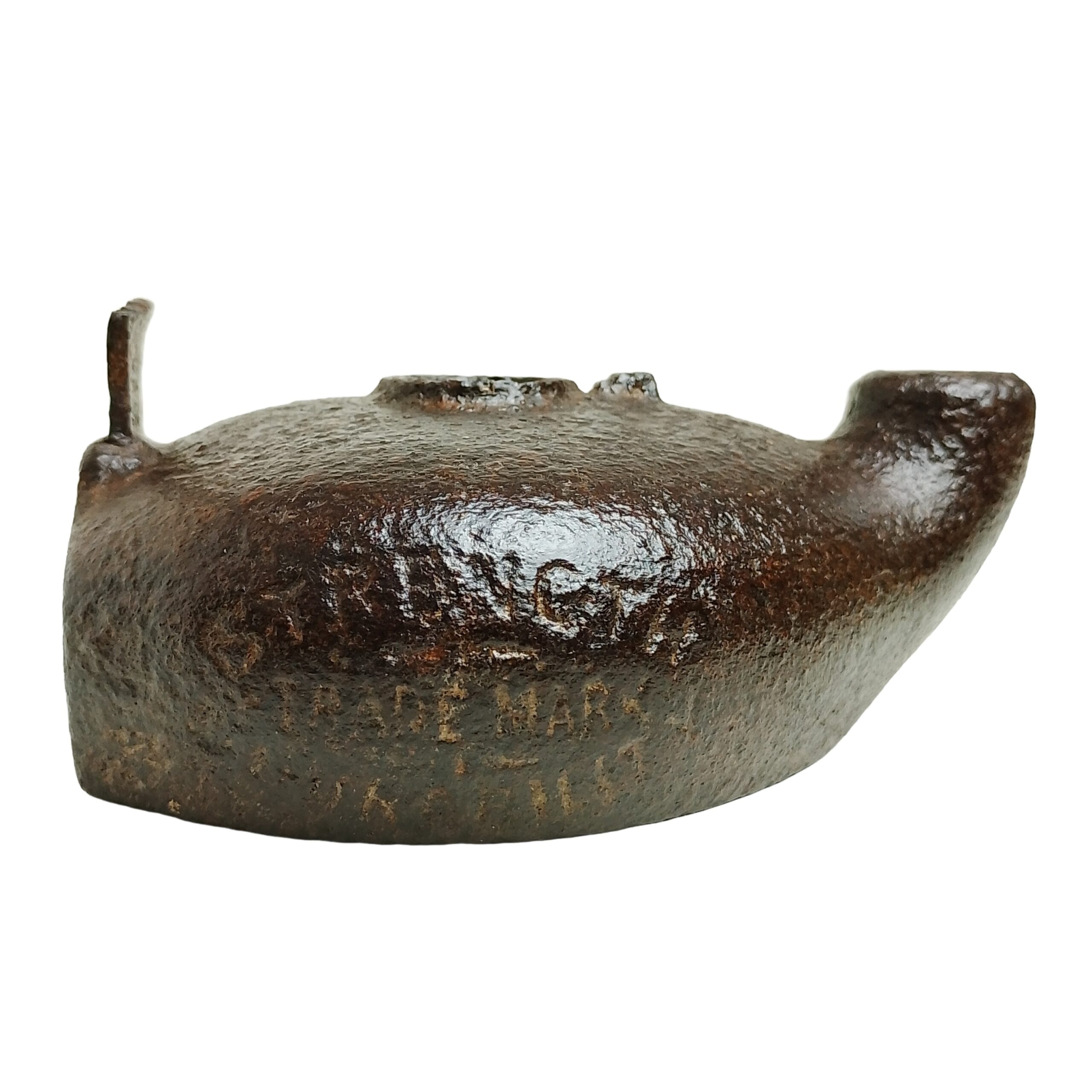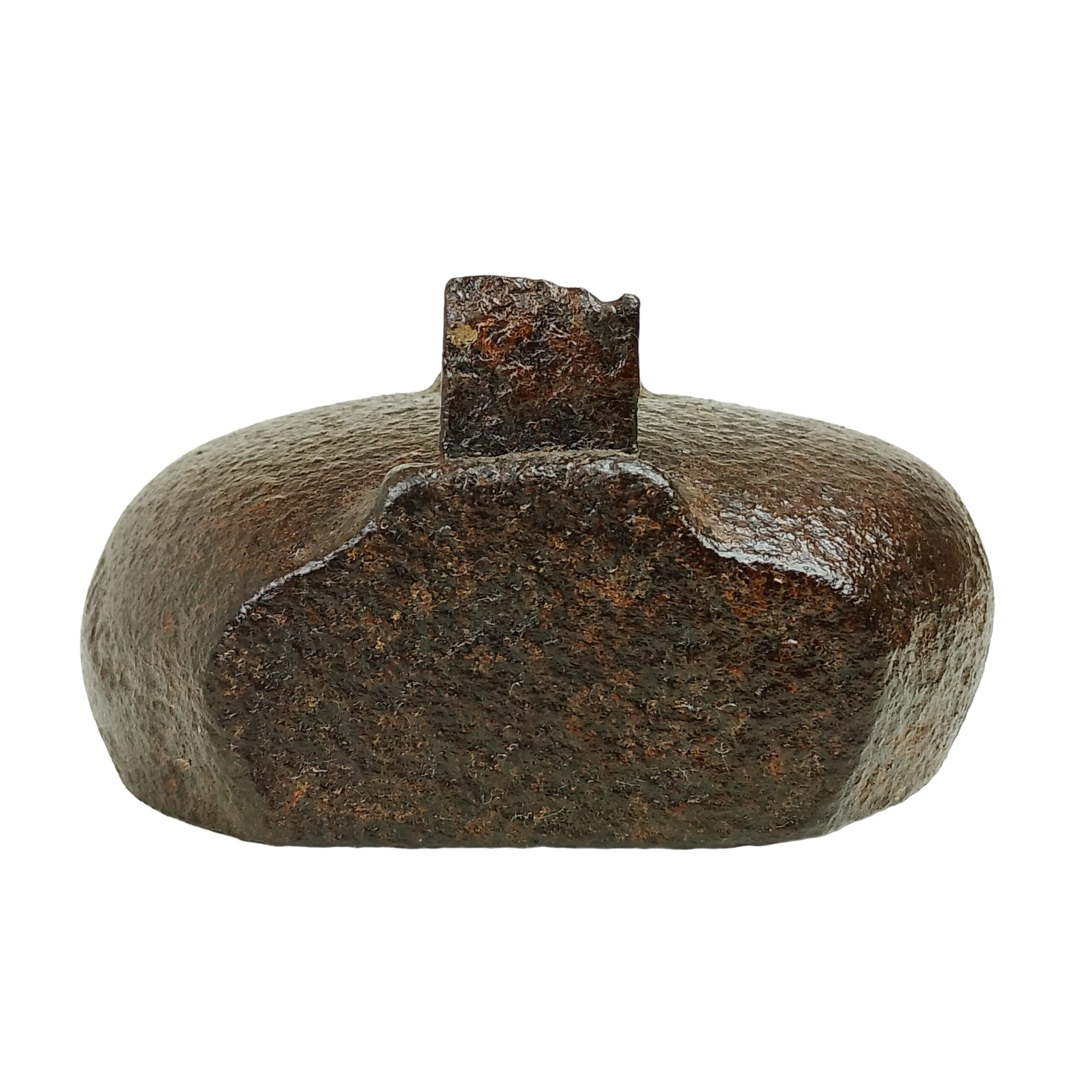 Candeeiro com bojo de forma oval, achatado, com a parte posterior plana e a parte anterior terminada em bico cilíndrico, recurvado ao alto na extremidade; centro com um orifício circular; tem, na parte posterior e ao meio, à frente do orifício, vestígios salientes do que deveria ser uma alça.